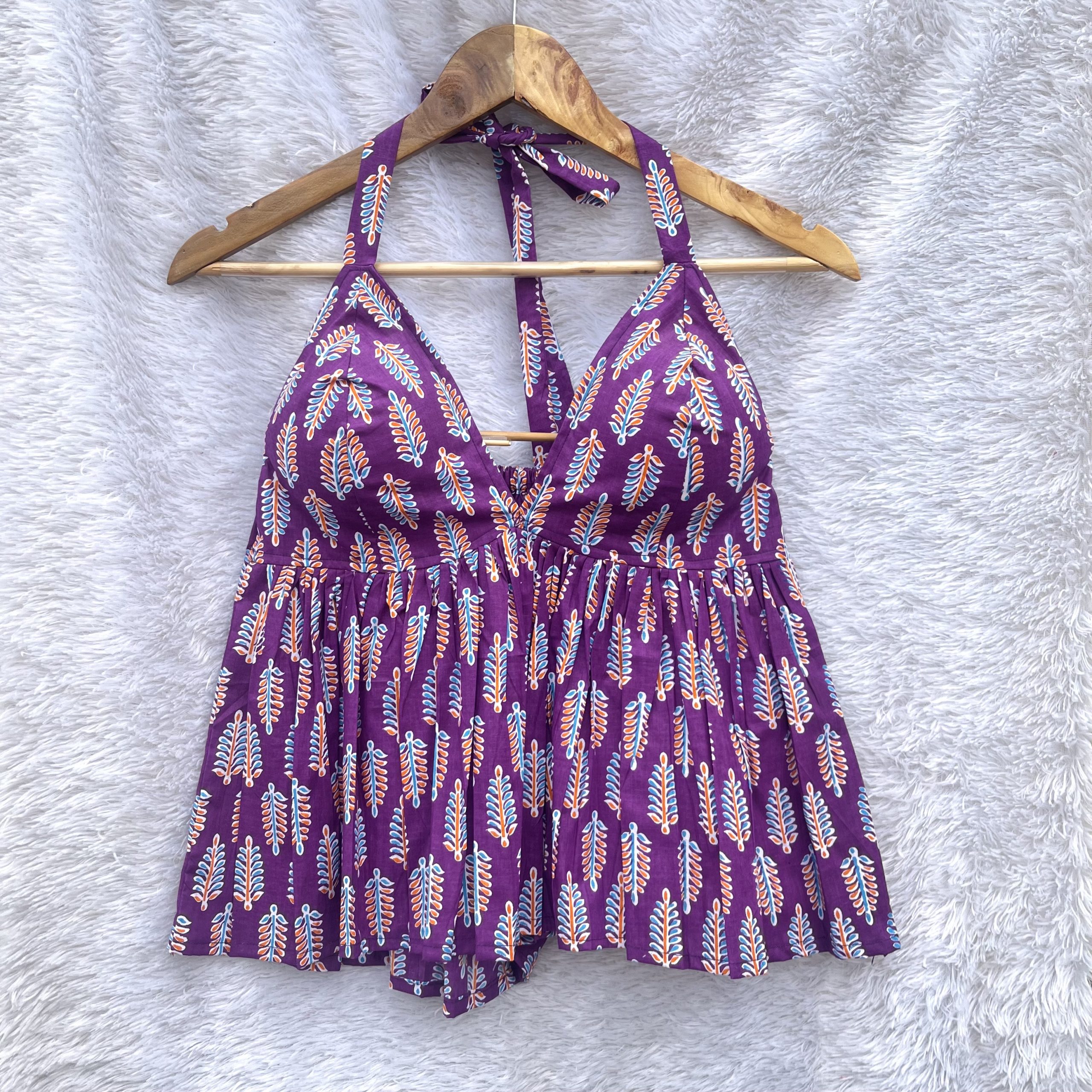 Product Discription- The soft and comfortable Puple Motif Halter Neck Top by Batikkart, made from soft cotton, pair with denims , skirts and pants flattering all body types.